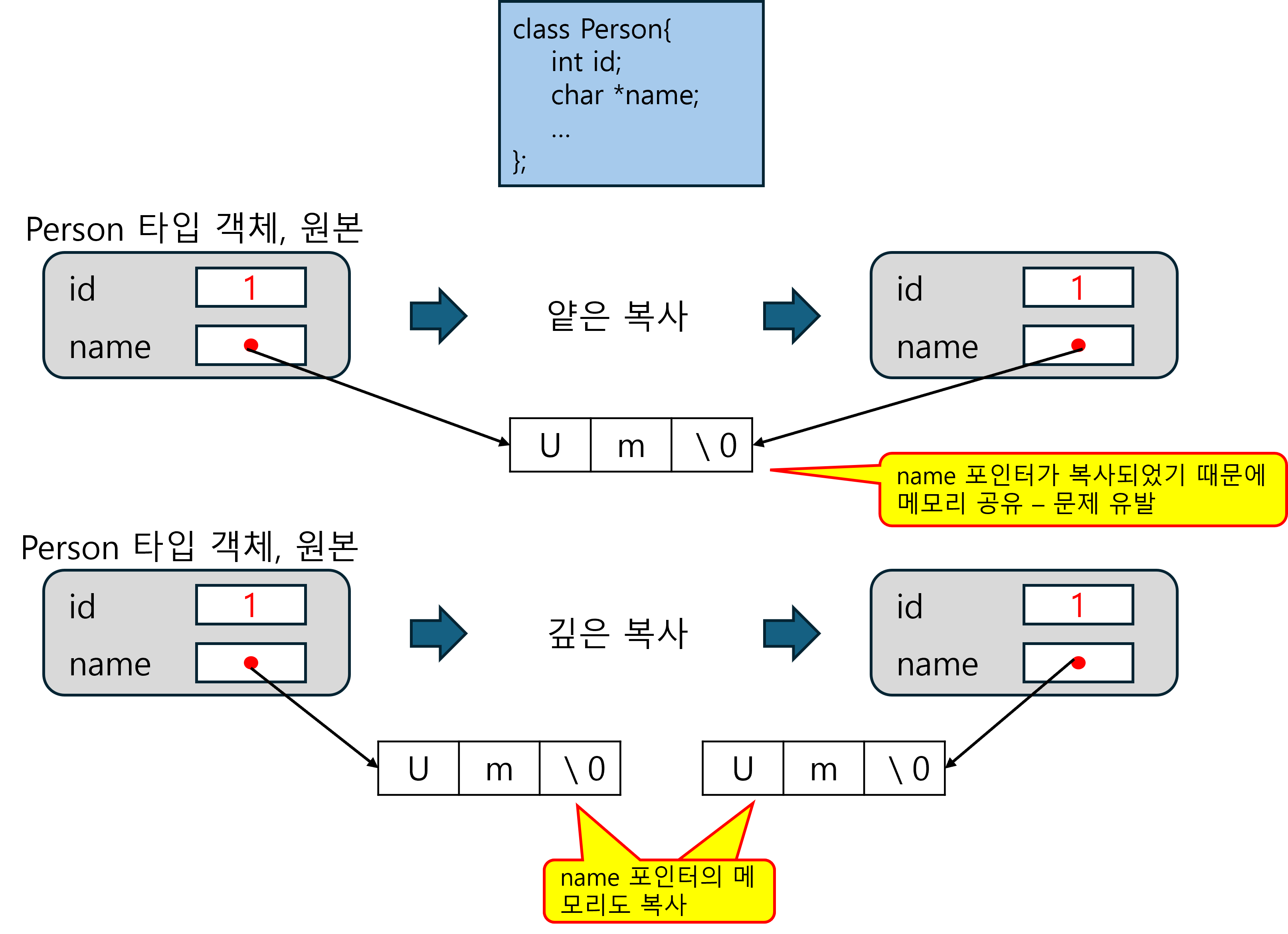 - 사본은 원본 객체가 할당 받은 메모리를 공유하는 문제 발생