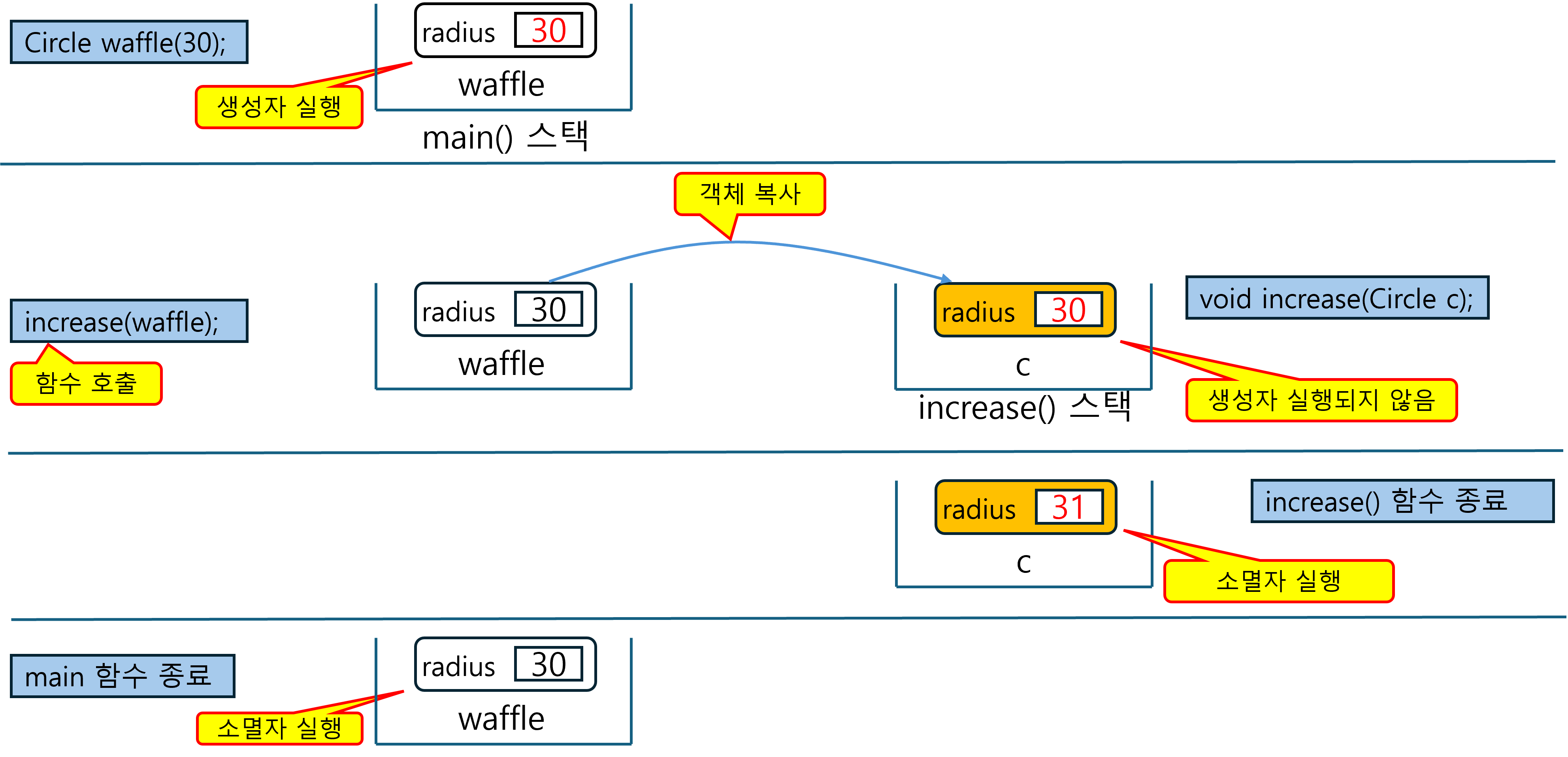 - 매개 변수 객체의 생성자는 호출되지 않음 (복사 생성자가 실행됨)