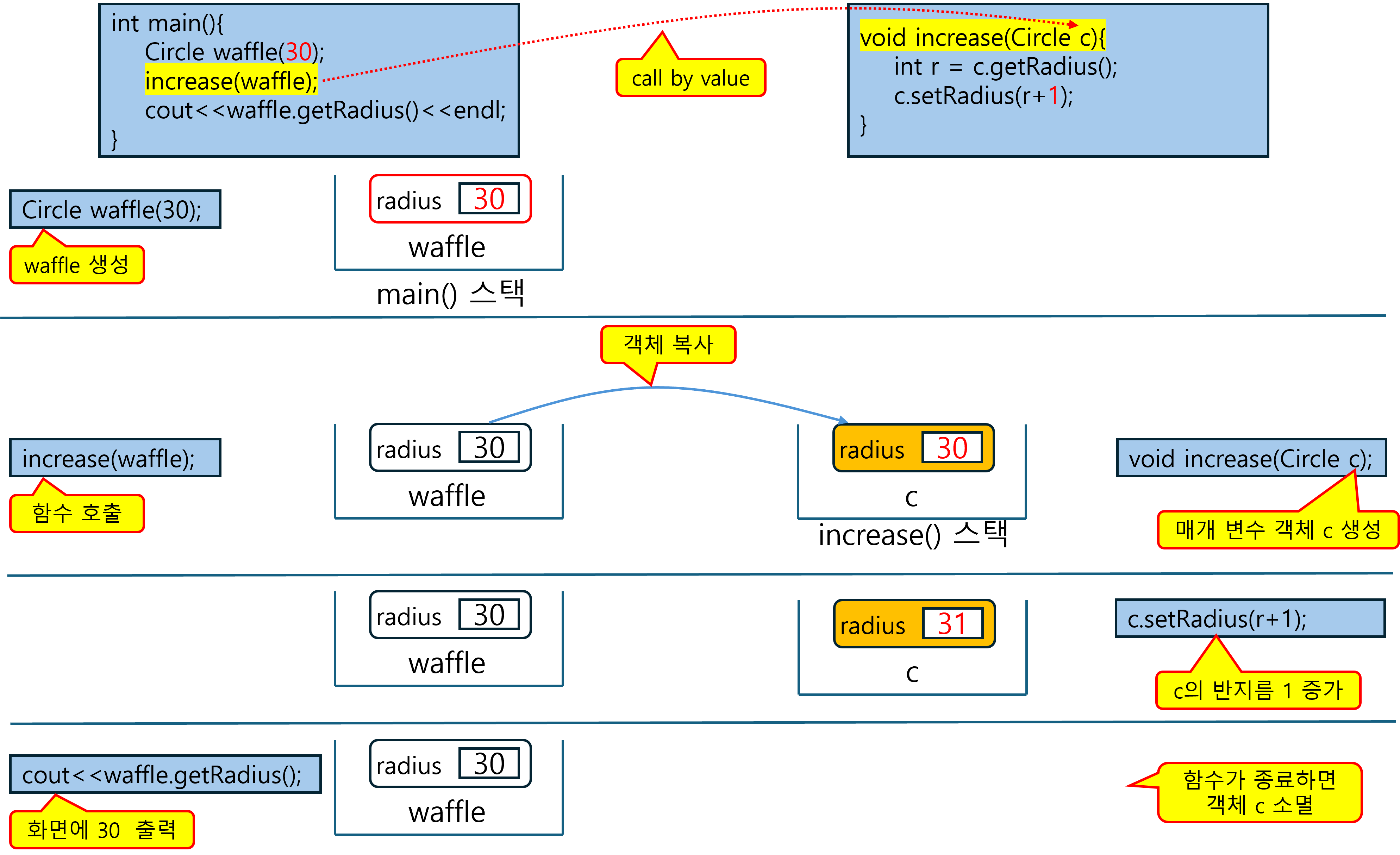 - 값에 의한 호출 시 매개 변수 객체의 생성자가 실행되지 않는 이유는? (복사 생성자 말하는 것이 아님)