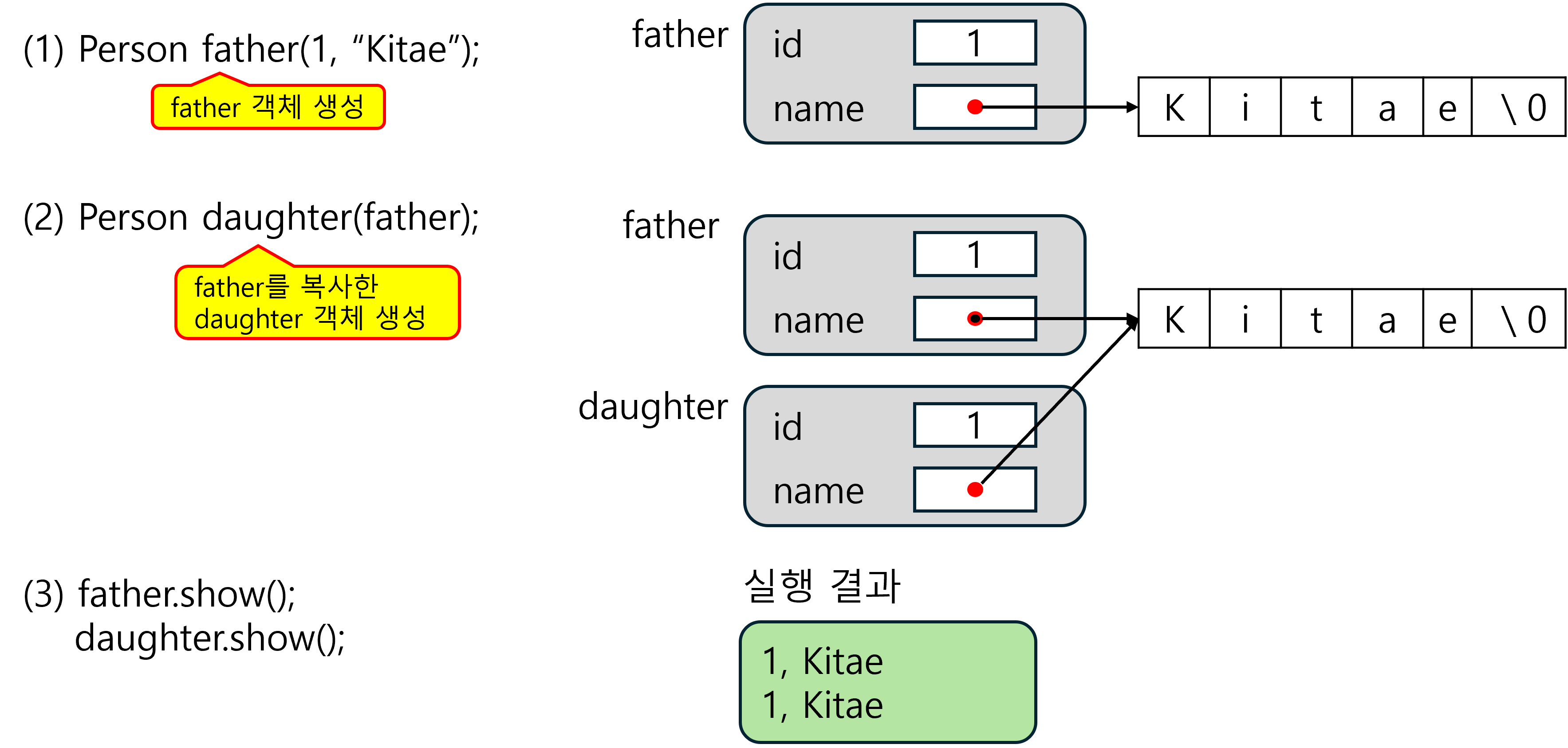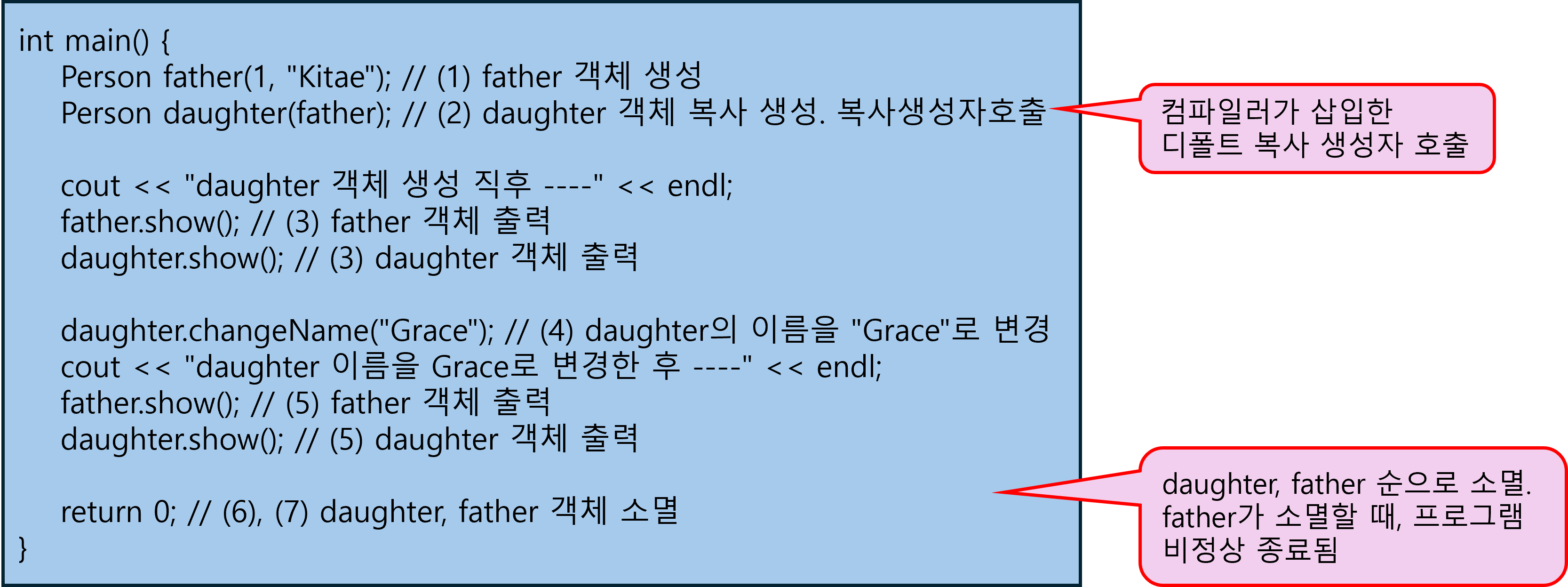 Person mother = father; // 1. 객체로 초기화하여 객체가 생성될 때, Person 객체의 복사 생성자 호출